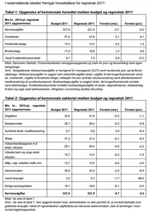 Hvor kommunerne i 2009 og 2010 overskred budgetterne med henholdsvis fem og to mia. kr., bremsede kommunerne sidste år den udvikling, så de i 2011 holdt serviceudgifterne 5,7 mia. kr. under det budgetterede. Det skal ses i sammenhæng med, at anlægsudgifterne samlet lå 1,4 mia. kr. over det budgetterede.