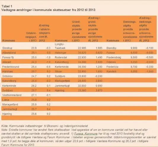 Nedenfor fremgår ændringer i skattesatserne fra 2012 til 2013, jf. kommunernes indberetninger.