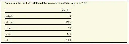 Holbæk, Odense, Læsø og Rebild kommuner har søgt om lov til at hæve skatten for samlet cirka 266 millioner kroner. Alle de fire kommuner har i dag fået tilladelse til at sætte skatten op. Ansøgningerne kan dog ikke imødekommes fuldt ud, fordi de overskrider rammen på 200 millioner kroner. Det er det beløb, som landets kommuner må hæve skatten for, hvis andre sætter den tilsvarende ned. Det ligger i regeringens økonomiaftale med KL.