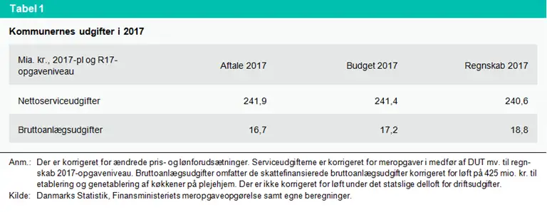 Kommunerne har sidste år brugt 240,6 mia. kr. på service, for eksempel til drift af kommunale daginstitutioner og plejehjem. Selvom det er 0,9 mia. kr. mindre end budgetteret, overskrider kommunerne de samlede budgetter for service og anlæg med 0,8 mia. kr. Det skyldes, at anlægsudgifterne overskrider det budgetterede niveau med 1,6 mia. kr. Kommunernes realiserede service- og anlægsudgifter ligger samlet set også over, hvad der er aftalt med regeringen.