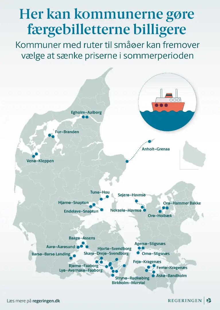 - I alt afsættes der fra 2019 86,4 mio. kr. årligt til at gøre det billigere for passagerer at tage færgen til og fra 30 øer. Desuden afsættes årligt i alt 36 mio. kr. til nedsættelse af færgetakster for gods.