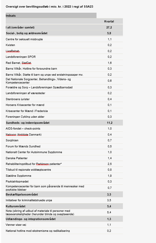 Der er tale om bevillinger fra henholdsvis Social-, Bolig- og Ældreministeriet, Indenrigs- og Sundhedsministeriet, Kulturministeriet, Beskæftigelsesministeriet og Udlændinge- og Integrationsministeriet. Bevillingerne løber fra januar til marts 2023 og udgør i alt 27,2 mio. kr.