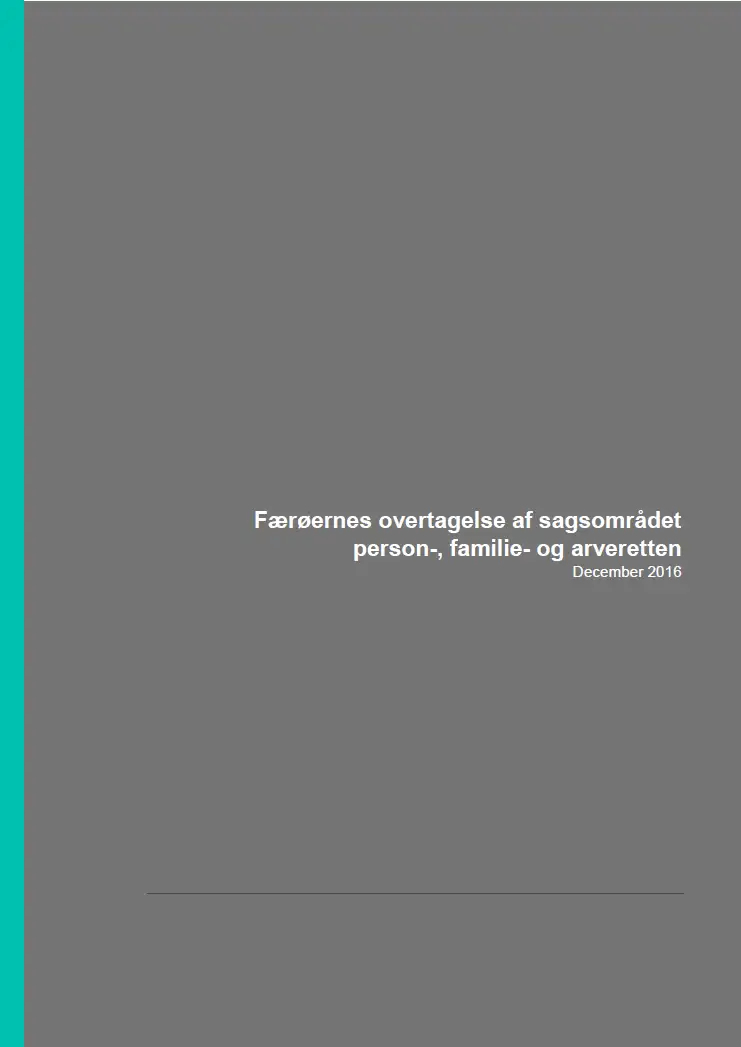 Det færøske landsstyre ønsker at overtage sagsområdet person-, familie- og arveretten den 29. juli 2018. Sagsområdet er i dag et dansk anliggende. Rapport er et led i et forberede grundlaget for en færøsk overtagelse og indeholder bl.a. beskriver af relevante problemstillinger i forbindelse med en færøsk overtagelse.