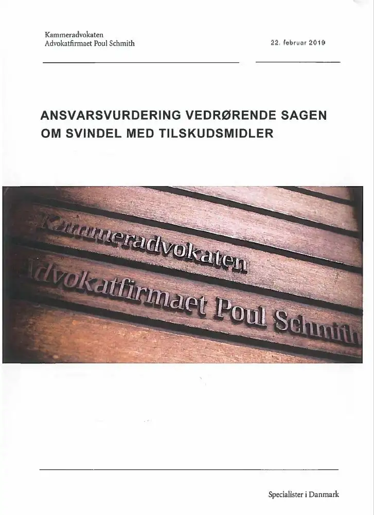 Social- og Indenrigsministeriet offentliggør Kammeradvokatens rapport om ansvarsvurdering vedrørende sagen om bedrageri med tilskudsmidler. Rapporten blev færdiggjort i februar 2019 og har indtil nu været delvist tilgængelig. Store dele var udeladt af hensyn til efterforskningen i sagen. Der er stadig oplysninger i rapporten, som ikke kan offentliggøres, da de berører enkeltpersoners private forhold.
